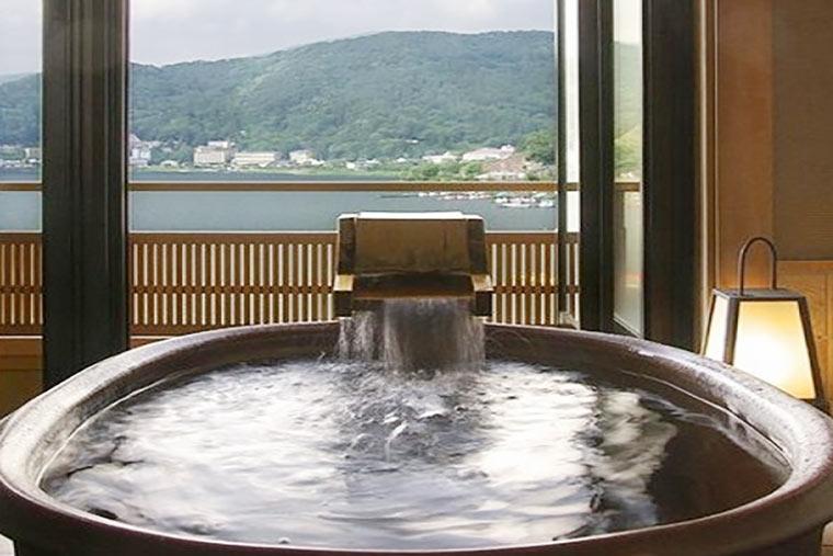 レイクビューの露天風呂付き客室で、湖面を渡る風を感じながらプライベートな湯浴みを