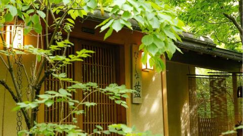全室露天風呂付きの数寄屋造り客室でゆったり。山里らしい素朴な会席料理に舌鼓を