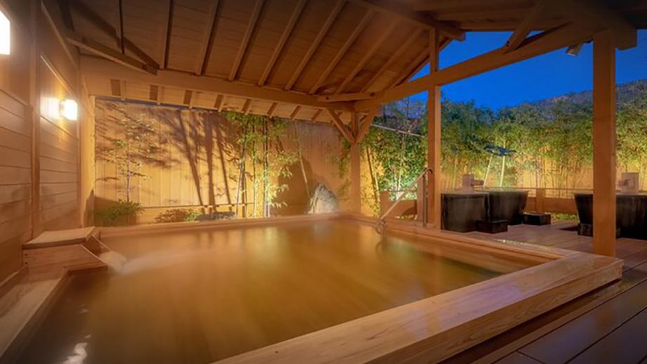 天然大風呂、天然露天風呂、サウナ、水風呂、打たせ湯などで湯浴みを満喫。塩化物泉のお湯は、浴後も湯冷めしにくくすべすべのお肌に導きます。和風庭園が眺められる露天風呂は、夜はライトアップされひと味違った雰囲気に。