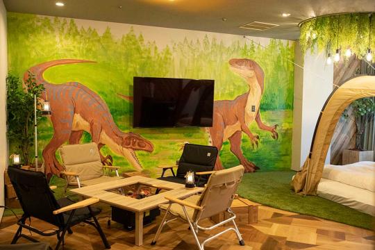 全国的に珍しい、恐竜とアウトドアを一度に楽しめるグランピング施設「京丹後久美浜LABO」。「外も中も恐竜だらけ」をコンセプトにしている宿泊部屋の「ダイナソールーム」は恐竜のシルエットを背景に、頭上にも恐竜が飛び、まさに恐竜だらけの部屋です。