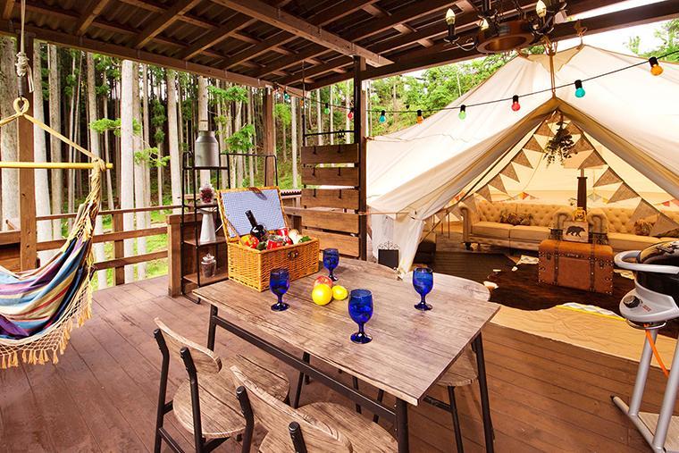 第2位は、高台の雑木林の中に佇み、富士山と河口湖を望む「河口湖カントリーコテージBan&グランピングリゾート」。ウッドデッキでハンモックに揺られたり、森林浴をしたりとゆったりアウトドアを満喫できます。