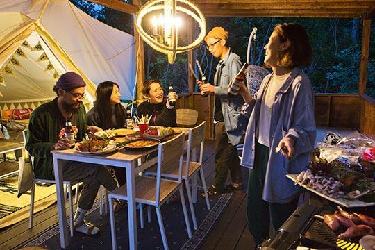 大きなデッキテラス付きのテント、庭やテラスを構えるテラスハウス、本格的なキッチンを配したテラスハウスプレミアムなど多彩なタイプが点在し、全室に必要な家具やアメニティを備え付け。夕食は房総の山海の幸を盛り込んだBBQや歴史的建築で楽しむ会席料理から、気分にあわせて選べます。