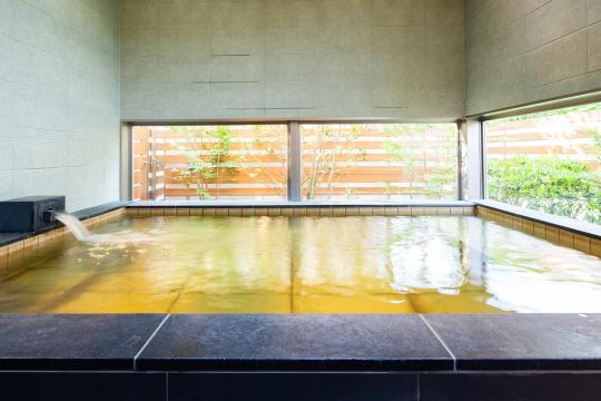 敷地内で湧出する温泉は、女性に人気の低張性弱アルカリ性高温泉。大浴場のほか、つぼ湯や畳敷きひのき風呂、岩盤浴付き風呂と個性豊かな3つの貸切風呂でも楽しめます。大浴場にはサウナも完備されているうえ、露天風呂付きVIPテントも。