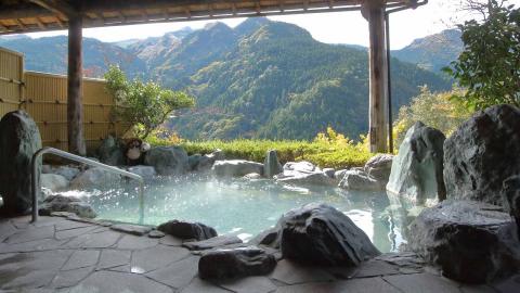 第3位は、2位と同じく祖谷温泉エリアに位置するお宿「和の宿 ホテル祖谷温泉」。宿の露天風呂は、ケーブルカーで約170m下の谷底へ降りた場所に設えてあり、秘境の雰囲気たっぷり。祖谷川のせせらぎを感じながら、源泉かけ流しの湯に入れます。ケーブルカーからは渓谷の大パノラマが一望でき、紅葉の時期や新緑の時期はまさに絶景。