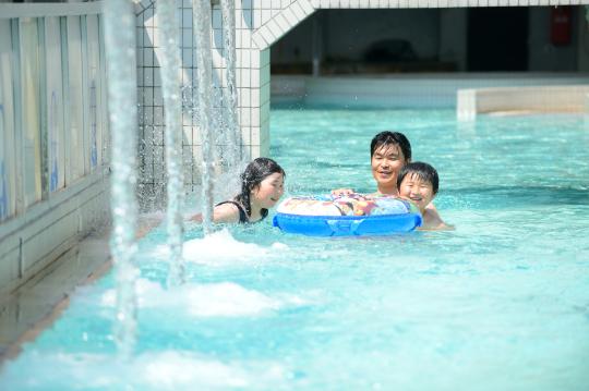 水着着用で利用する「バーデゾーン」には、あらゆる方向から噴水が飛び出す屋内大プールやレッスンプログラムも充実した25メートルプールなど、屋内外に10種のプールが用意されています。雨の日や寒い日でも快適に楽しむことができ、プール用おむつの着用で1歳から利用可能となっています。水着やキャップ、タオルなどはレンタル可能なので、手ぶらでエンジョイできるのも魅力です。
