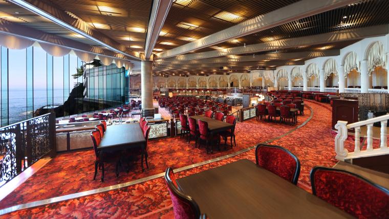 巨大な扇状が特徴的なレストラン「メインダイニング錦」でいただけるビュッフェは、夕食・朝食ともに宿泊者限定。夕食は、目の前で調理するライブキッチンをはじめ、地元伊豆の味覚を盛り込んだ料理など、約90種の和洋中メニューを用意しています。