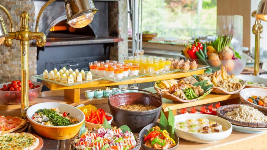 全長約15メートルのライブキッチンカウンターと本格的な石窯が自慢のレストランでいただくのは、地元産の旬食材を使用した品数豊富なビュッフェ。夕食は約70種以上で、和食・洋食・スイーツそれぞれの料理人が腕をふるうメニューがそろいます。中でも、もちもち食感の石窯ピザは子どもから大人まで大人気!