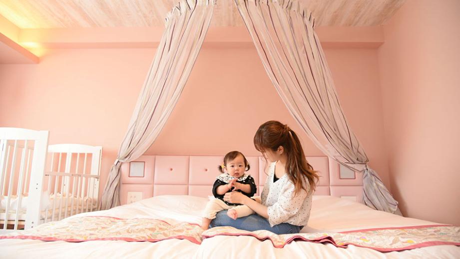 ママの声から生まれた「ベビーズスイートルーム」は、靴を脱いで入る楽ちん空間。クッション性のある最上級のコルク材を使用した床や、角が丸みを帯びた家具、赤ちゃん用の枕を備えるローベッド、離乳食を温める電子レンジなど、赤ちゃんが安心安全で過ごせる設備が満載です。また、おもちゃや絵本、ベビーカー、ベッドガードなどのレンタル備品も充実しています。