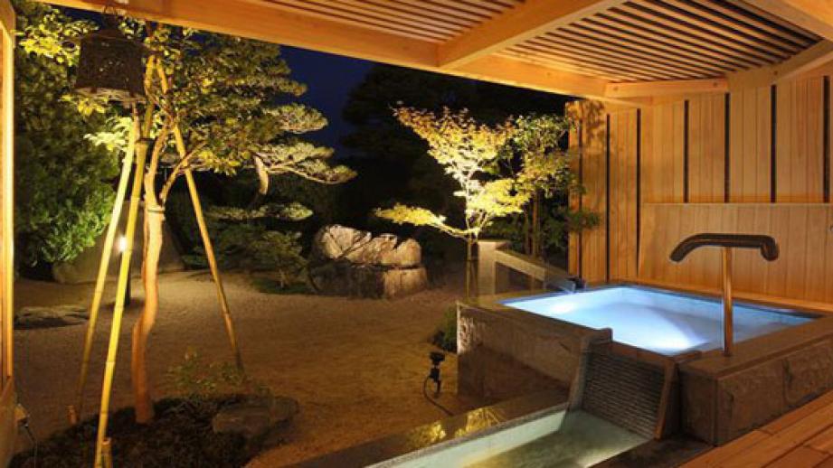 こだわりのデザインや家具を備えたお部屋は、全てコンセプトが異なるしつらえ。最上階には露天風呂付き客室も備えています。畳敷きの大浴場は、滑りにくく柔らかな歩きごこち。露天風呂からは三河湾の景色が望め、天気の良い日には富士山が見えることも。