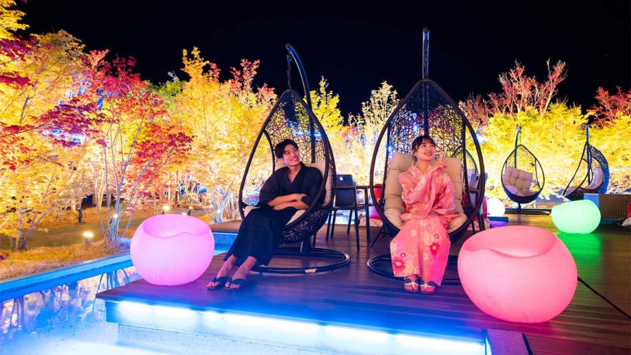 ここには動物と触れ合える広大な約1,000坪の日本庭園のほかに、プールや海の目の前で足湯や足水ができます。夜には庭園が幻想的な「光の森」にライトアップされたりするので、クリスマスシーズンにも最適です。