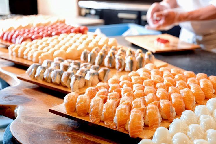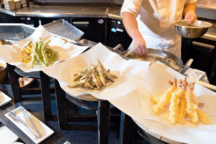ライブキッチンでは職人が寿司や天婦羅、ステーキを仕上げる臨場感も楽しめます。サーモンやホタテなど、道東の旬の魚介が並び、北海道らしい味覚の饗宴が広がります。