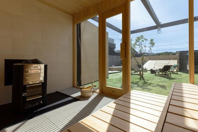 そして、もうひとつの魅力が薪の香りに包まれるプライベートサウナ。ログハウスのような温もりあるサウナ室を貸切で利用でき、焚かれる薪の音と香りが心地よく響きます。