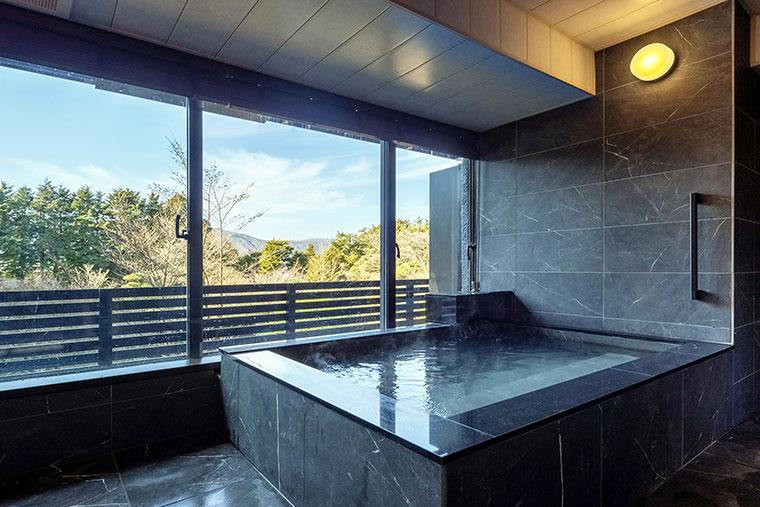 客室のお風呂には、大涌谷温泉(期間により宮城野温泉の単純泉)を引き入れています。湯あたりがやわらかく、体を包むように温めてくれる湯で、冬特有の強張りをほどきながら、深部までじんわりと温まっていきます。