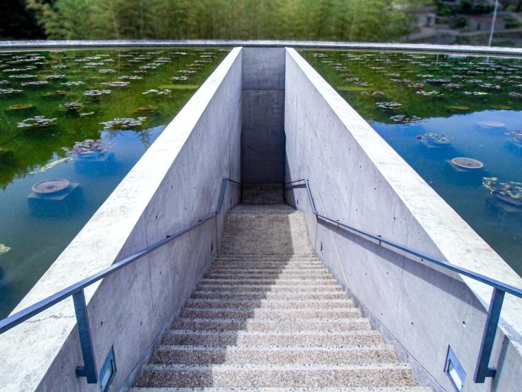 平安後期創建の真言宗御室派のお寺「本福寺(ほんぷくじ)」。コンクリート造りの「水御堂(みずみどう)」は安藤忠雄氏の設計で、蓮池の真下にあるユニークな造りになっています。