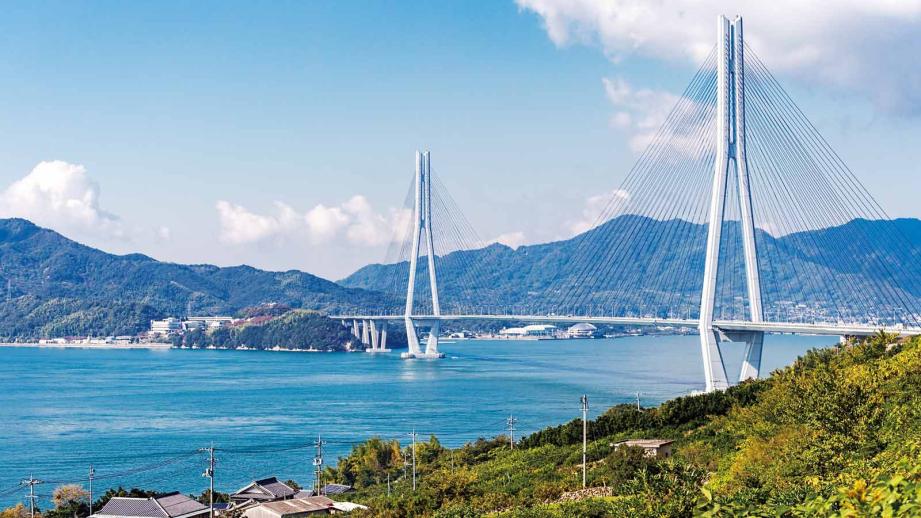 愛媛県の今治市から芸予諸島の大島を結び、鳴門、関門と並んで日本三大急潮流に数えられる来島海峡に架かる橋。世界初の3連吊橋であり、全長約4kmの橋の両側には、小型バイク道と自転車歩行者道が設けられていて、徒歩や自転車でも渡れます。今治の「糸山展望台」と大島の「亀老山展望台」からの瀬戸内海と橋の眺めは絶景です。
