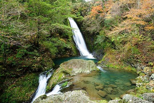 白滝、二見滝、紅葉滝、鶏鳴滝(けいめいたき)の4つの滝がある渓谷。滝の落差はおよそ9メートルから33メートルまであり、それぞれに個性的な流れを望むことができます。険しい岩肌を流れ落ちる滝や自然を眺めながら歩く約2キロメートルの遊歩道も完備。