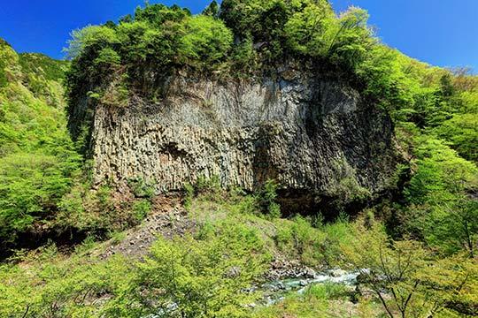 高さ約72メートル、幅約120メートルの柱状節理の「巌立峡(がんだてきょう)」。今からおよそ5万4,000年前に御嶽山の大噴火で溶岩が流出してできた大岩壁で、県指定の天然記念物となっています。