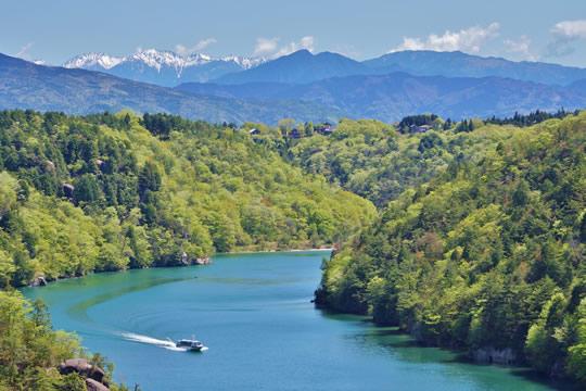 木曽川を大井ダムでせき止めてできた人造湖で、1920(大正9)年に地理学者の志賀重昴によって「恵那峡」と命名されました。両岸には獅子岩、屏風岩など数多くの景勝地があり、遊覧船でのパノラマクルージングが人気です。ダム湖右岸の「さざなみ公園」には散策路が整備され、湖を背景に桜、藤、ヤマツツジなど四季折々の景観を堪能できます。