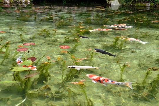 関市板取の根道神社境内にある名もなき池。透明度の高い湧水に咲く睡蓮と、色とりどりの錦鯉が泳ぐ姿がとても美しく、フランスの画家クロード・モネが描いた『睡蓮』に似ていることから、通称「モネの池」と呼ばれています。ネットやテレビなどでも紹介され、特に初夏の睡蓮の花が咲く時期はプロアマ問わず多くのカメラマンの撮影スポットに。