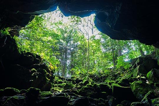 富士山噴火によって生じた溶岩地帯に樹木が茂り森が生まれたのが「富士山御胎内清宏園(おたいないせいこうえん)」。四季折々の自然や植物、野鳥などが見られ、豊かな緑に心が癒やされます。園内には、噴火によってできた国指定天然記念物熔岩隧道(すいどう)「御胎内(おたいない)」があり、内部を見学することも可能。人体の内部に似ていることがその名前の由来になっています。