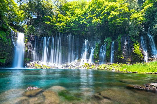 世界遺産富士山の構成資産のひとつに登録されている「白糸の滝(しらいとのたき)」。高さ約20メートル・幅約150メートルの湾曲した絶壁から、大小数百の滝がまるで無数の糸が垂れているような姿で流れ落ちています。透き通る水によって底まで見える滝壺は、エメラルドグリーンが目にも鮮やか。周辺の自然と相まって、神秘的な風景が見られます。