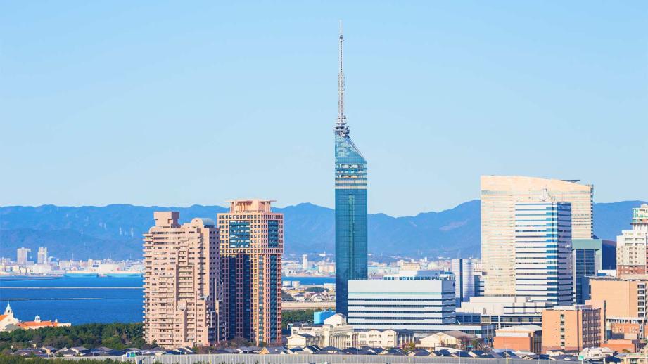 「福岡タワー」は全長234メートル、海浜タワーとしては日本一の高さを誇り、外観は8,000枚ものハーフミラーで覆われています。地上123メートルの展望室からは福岡市街や博多湾が一望でき、夜景スポットとしても人気。