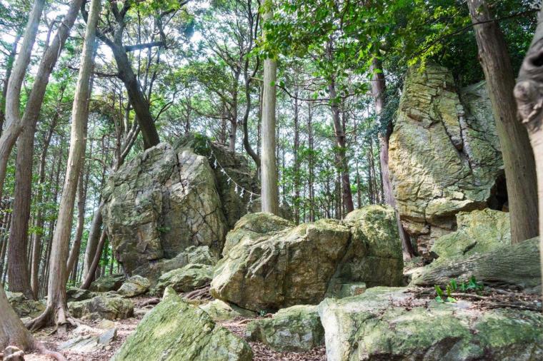 渭伊神社の本殿後ろ「薬師山」にある古代の祭祀場遺跡と伝わる「天白磐座(てんぱくいわくら)遺跡」。巨大な石が絶妙なバランスでいくつも配置されており、遺跡からは土器や勾玉、鉄矛などがいくつも見つかっています。2017年の大河ドラマ「おんな城主 直虎」のロケ地としても使われました。