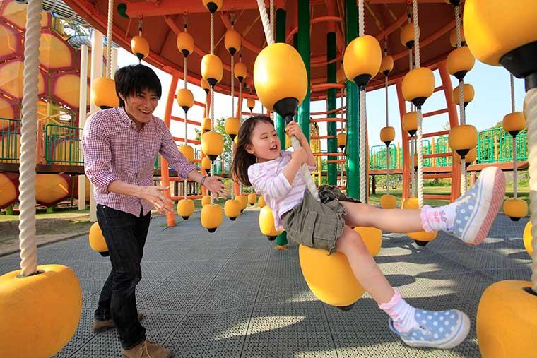 2つのエリアからなるレジャーパークは、西エリアでは地ビールが飲めるレストランやフードコート、フルーツをモチーフにした大型遊具や「ふわふわ広場」など子どもも大満足の遊具がそろいます。東エリアはセグウェイなどのアクティビティや、広大な果樹園が。1日中家族みんなで遊びつくせます。