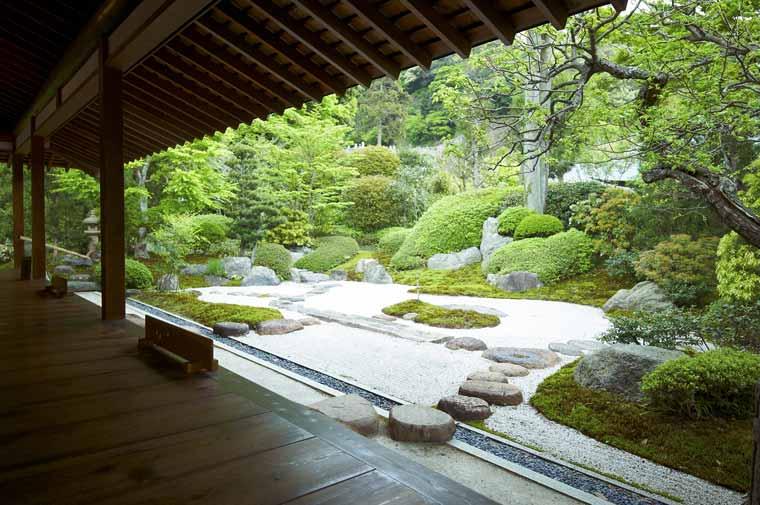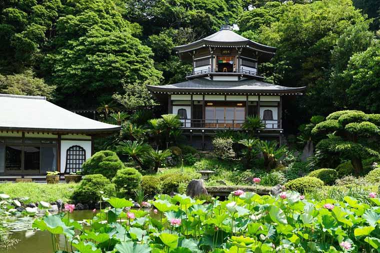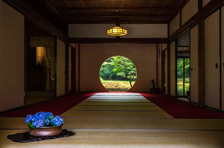 境内にはおよそ2,500株のあじさいが植えられており、「紫陽花寺」とも呼ばれる臨済宗建長寺派の寺院。本堂の悟りの窓(丸窓)からは、幻想的な世界を眺めることができます。和の空間から望む四季折々の景色は、まるで絵画のような美しさ。丸窓の向こうにある庭園は、通常立ち入り禁止ですが、花しょうぶと紅葉の時期のみ特別公開されます。境内は広く、北条時頼の墓所や鎌倉最大のやぐら(洞窟墳墓)など見どころ多数。