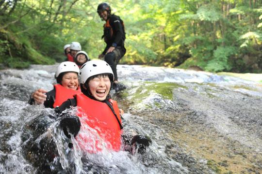 自然を満喫しながら川の流れとともに渓谷を下るアクティビティが、鬼怒川でも楽しめます。岩盤でできた滑床にヘッドスライディングしたり、滝壺に飛び込んだりしながら、大自然との一体感とスリルを味わえます。鬼怒川の透き通った沢の美しさに感動すること間違いなし!