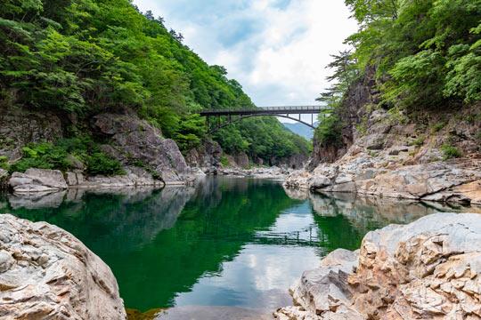 巨大な奇岩や怪石が生み出す自然の造形美と山々の緑のコントラストは、圧巻の美しさ。川治温泉からは比較的歩きやすい遊歩道が整備されているので、のんびりとハイキングを楽しむのもおすすめです。