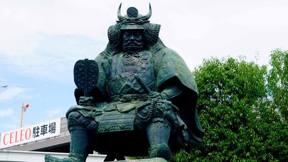 甲府駅南口を出てすぐ右側にどっしりと鎮座している甲府のシンボル的存在の武田信玄公像。まさに動かざること山の如しといったように迫力ある大きな体をして右手に軍配、左手には数珠を持ち、座っています。やはり甲府といえば武田信玄です。