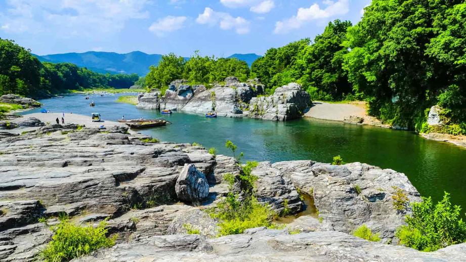 折り重なる岩畳の下に流れる川と、まわりに広がる山とのコントラストは圧巻です。