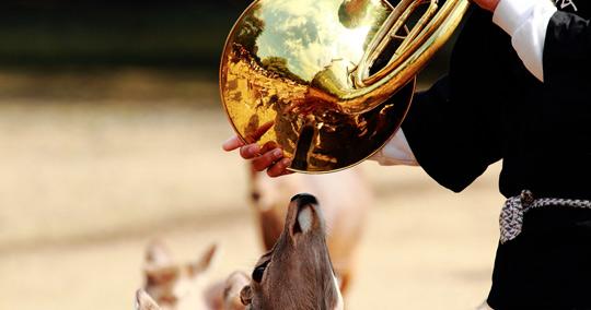ナチュラルホルンの音にたくさんの鹿が駆け集まる様子は壮観。なかには、奈良公園にデビューしたばかりの子鹿たちにも。秋の風物詩「鹿の角きり」とともに、この地域ならではのイベントです。