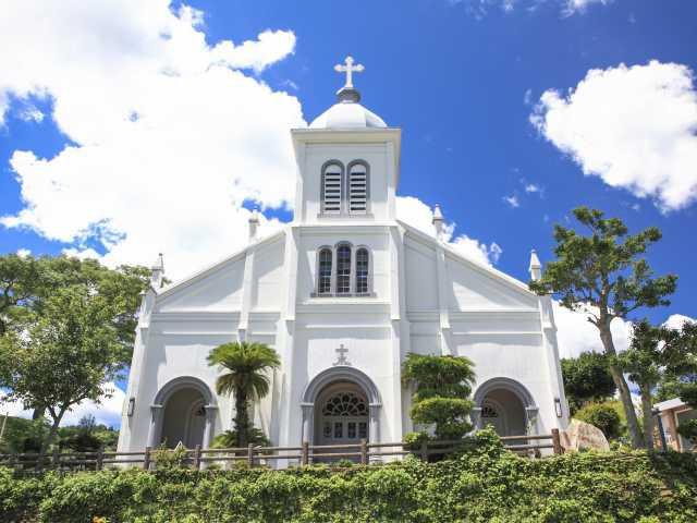 小高い丘の上に建つロマネスク様式の教会。昭和8(1933)年にガルニエ神父と地元信者が協力して建てた。真っ白い外観は優美で、ステンドグラスをはめ込んだ教会内には聖画が飾られていて厳かな雰囲気。天主堂横のルルドの聖母像も必見。