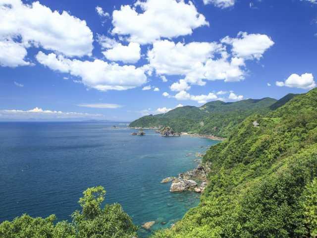 天草灘の波と風が造り上げた奇岩が連続する天草西海岸。この景勝地を代表するビュースポット。妙見浦のバス停から山道を2分ほど下ると海岸へ出る。遠望なら岬の先端部にある十三仏公園からの眺望が定番。岩礁と真っ青な海が織り成すコントラストがすばらしい。