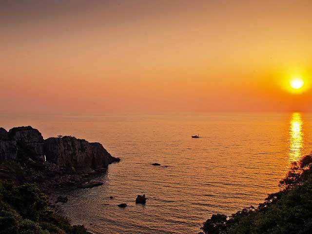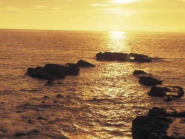 天草下島の西海岸を走る国道389号は、別名「天草西海岸サンセットライン」。東シナ海に太陽が沈むとき、その光は海面に反射してまばゆいほどに輝きを増し、あたり一面を黄金色に染める。夕景ポイントのひとつ、鬼海ヶ浦展望所は下田温泉から車で5分足らず。