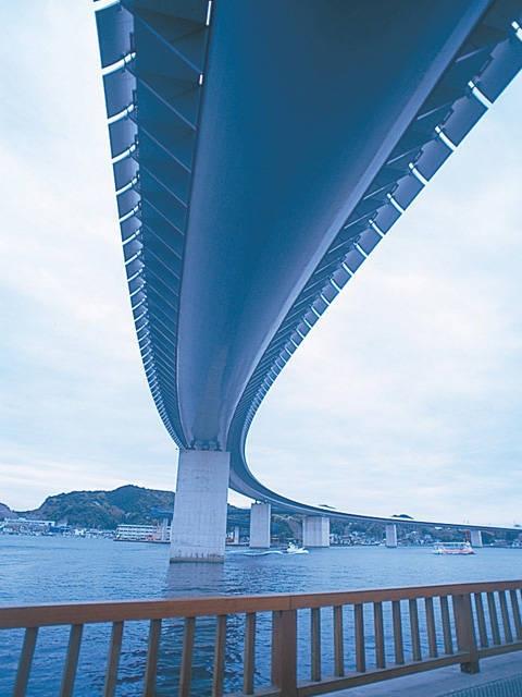 イタリアの建築家レンゾ・ピアノ氏の設計による全長883mの橋。牛深漁港から後浜新漁港へ至るメインルートの役割を担う。夜間はライトアップされ幻想的な景観となる。