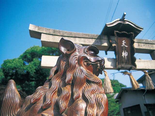 千年の歴史をもつ由緒ある神社。境内には奉納された備前焼がところ狭しと並ぶ。参道の敷石や神門の瓦、狛犬は備前焼で、参道沿いの塀には陶印入りの陶板を埋め込んでいる。