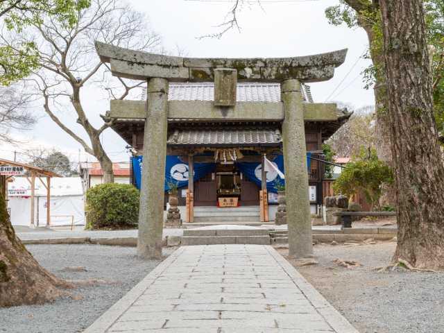 元号「令和」の引用元である万葉集の梅花の宴が開かれた場所とされる神社。元号の由来となった和歌「初春の令月にして気淑く風和らぎ」と書かれた石碑がある。
