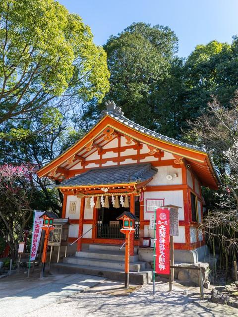 太宰府天満宮の北東にある赤い鳥居に囲まれた神社。参拝は、まず手前の12本の鈴の中から自分の干支の鈴を見つけて鳴らし、その後、奥の大きな鈴を鳴らしてお参りする。