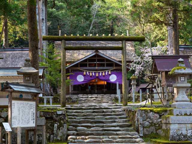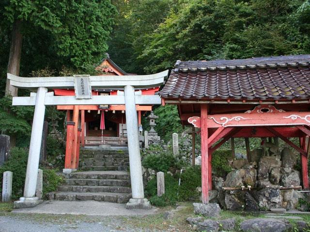 大江町にある元伊勢三社のうちの一社で、深閑とした渓谷のなか、岩壁の急勾配上に社殿が建てられている。備え付けの鎖をつたって登り参拝するワイルドかつ個性的な神社。