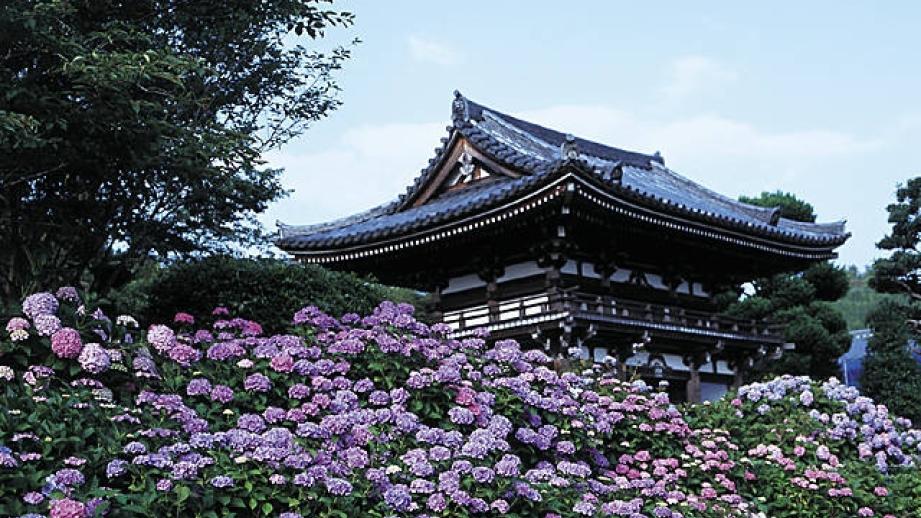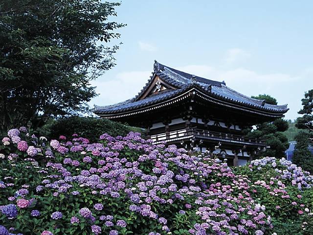 関西花の寺25か所霊場の第1番札所。あじさい寺として有名。6月上旬から7月にかけては境内一面に約1万本のアジサイが咲き誇り、6月だけで2万5千人もの観光客でにぎわう。