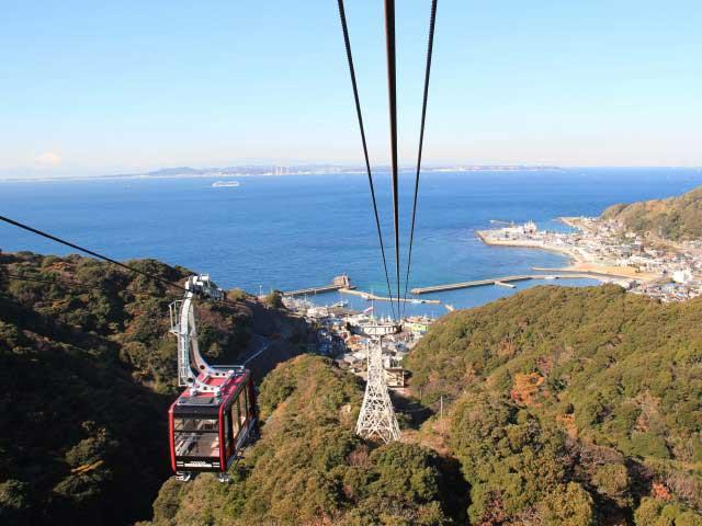 鋸山山麓駅から山頂駅を結ぶ全長680mのロープウェーは5~15分間隔で運行。眼下には東京湾、晴天時には富士山まで眺められ、まさに動く展望台。四季折々に見られる山の表情もすばらしい。