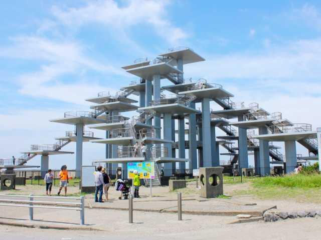 東京湾に突き出た約5kmの砂州の先端に立つ展望台。五葉松をかたどった形が印象的だ。海の眺めが素晴らしく、空気が澄んだ日には遠く富士山も見える。「関東の富士見百景」に選定されている。
