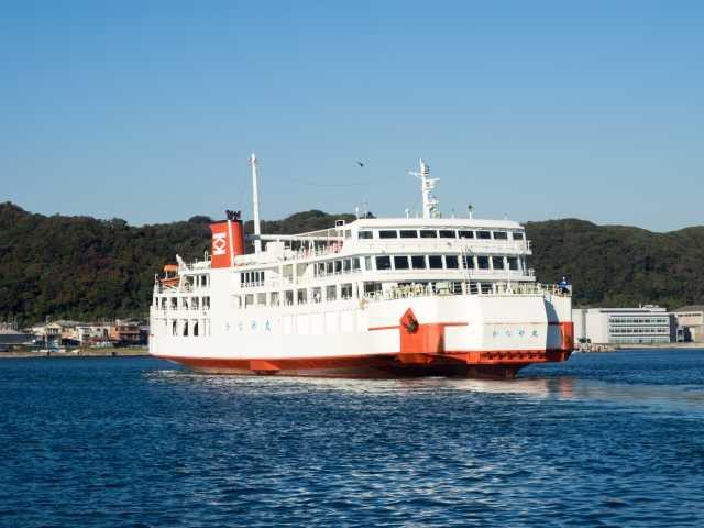 金谷港と神奈川・三浦半島の久里浜港の間をわずか40分で結ぶ東京湾フェリーが発着。船内にはオーシャンビューシートもあり、のんびりと美しい海の景色が楽しめる。
