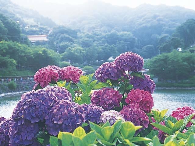 梅雨の季節、約5万数千株のあじさいが咲き誇る。6月のあじさい祭り期間中、夜間は9時半までライトアップされ、幻想的な風景を楽しめる。また、運が良ければゲンジボタルを見ることができる。