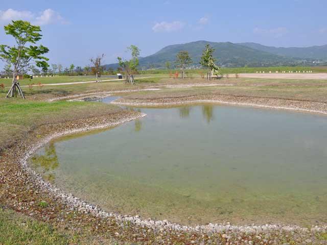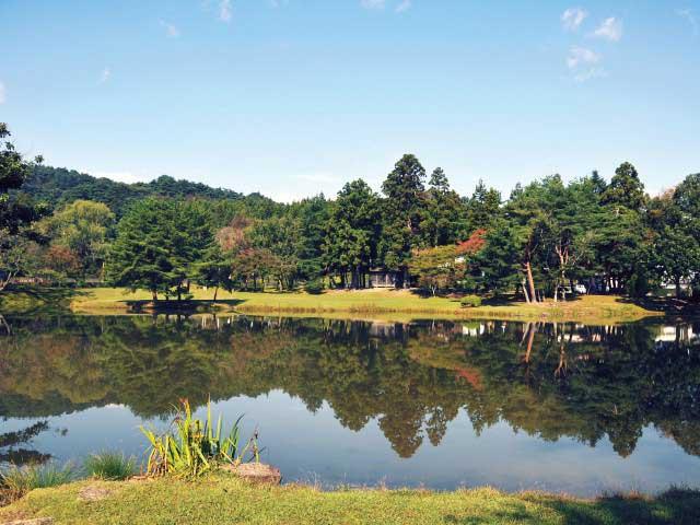 京の平等院鳳凰堂を模して建てられ、復元整備を行っている。浄土庭園の水辺に姿を写す壮麗な寺院を想像しながら歩いてみよう。