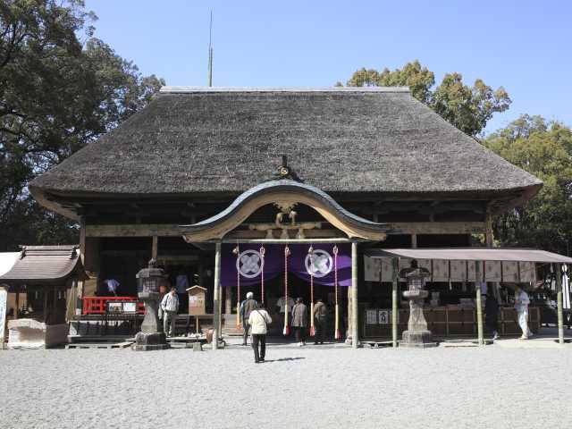大同元(806)年に創建。慶長15(1610)年に再建された建物は、400年を超える。本殿、廊、幣殿、拝殿、楼門は国宝。見どころは、華麗な桃山様式と球磨地方独自の社寺建造物の特徴が見られる社殿。黒、金、赤などの漆で彩色され、社紋の鷹の羽や昇龍、瑞雲などが彫刻されている。