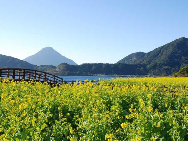 大昔の火山活動によって陥没してできたとされる周囲約15km、最大水深233mのカルデラ湖で、大きさは九州最大。湖水は藍色に澄み、12月下旬からは菜の花、4月中旬からはポピーやパンジーが湖畔を彩る。